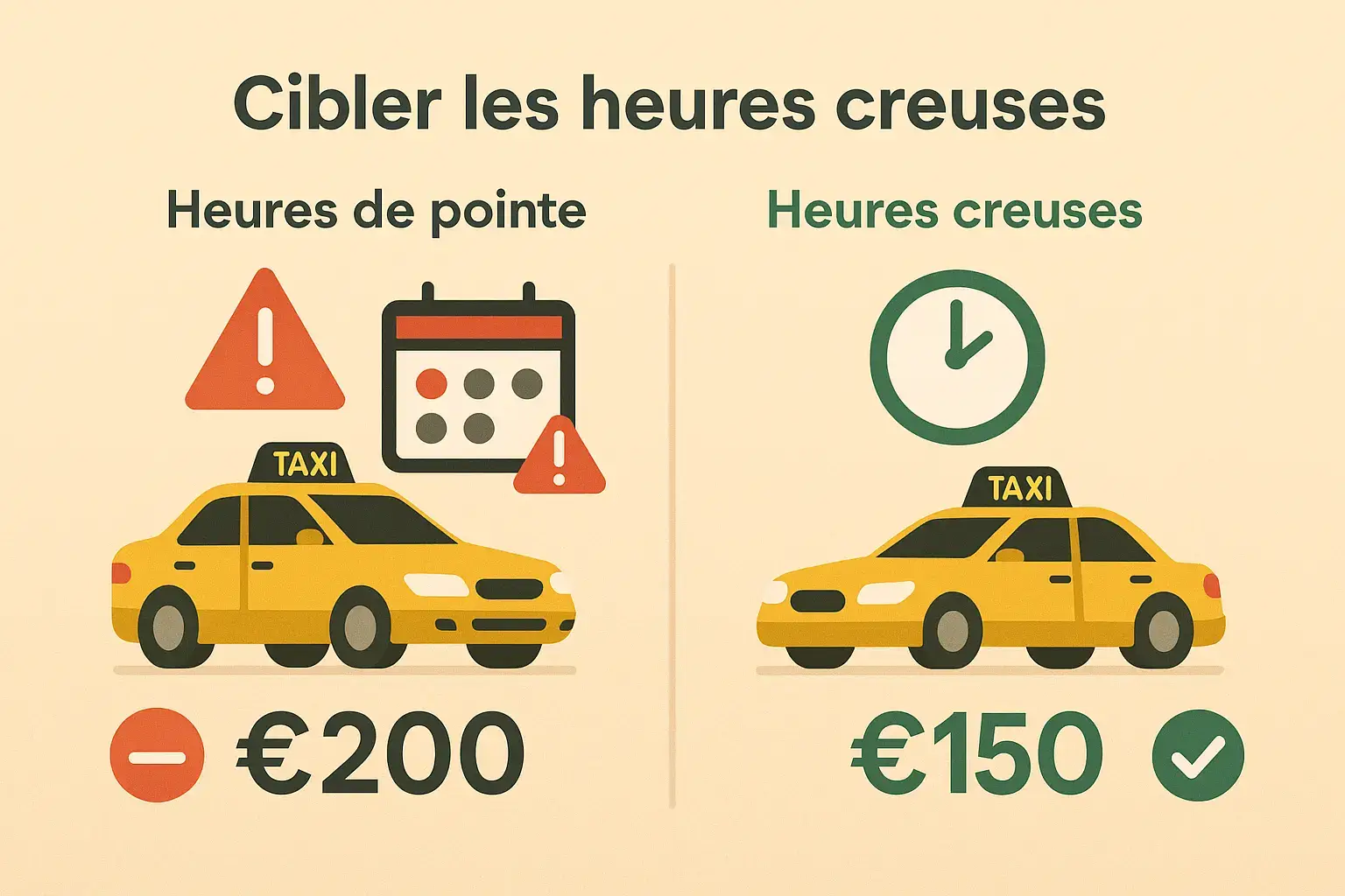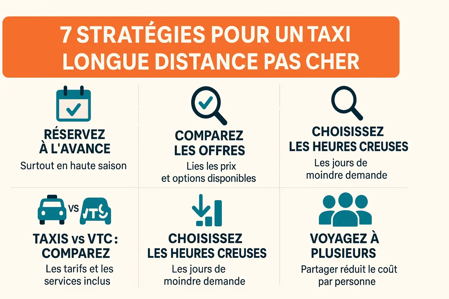 Les taxis longue distance ne sont pas forcément hors de prix. En combinant 7 stratégies simples — réservation anticipée, comparaison forfaitaire taxis/VTC, bons créneaux et vérification des inclusions — vous pouvez baisser nettement la facture sans sacrifier le confort ni la fiabilité. Parcourez les sections clés ou appliquez-les toutes pour maximiser l’économie :